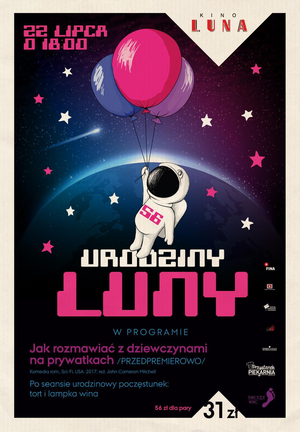 Z tej okazji obejrzymy razem film „JAK ROZMAWIAĆ Z DZIEWCZYNA MI NAPRYWATKACH", napijemy się wina Barefoot Wine & Bubbly oraz zjemy tort od Przystanku Piekarnia. W programie również impreza w kosmicznym klimacie. Przypominamy, że inspiracją dla nazwy kina był radziecki program kosmiczny - Łuna.