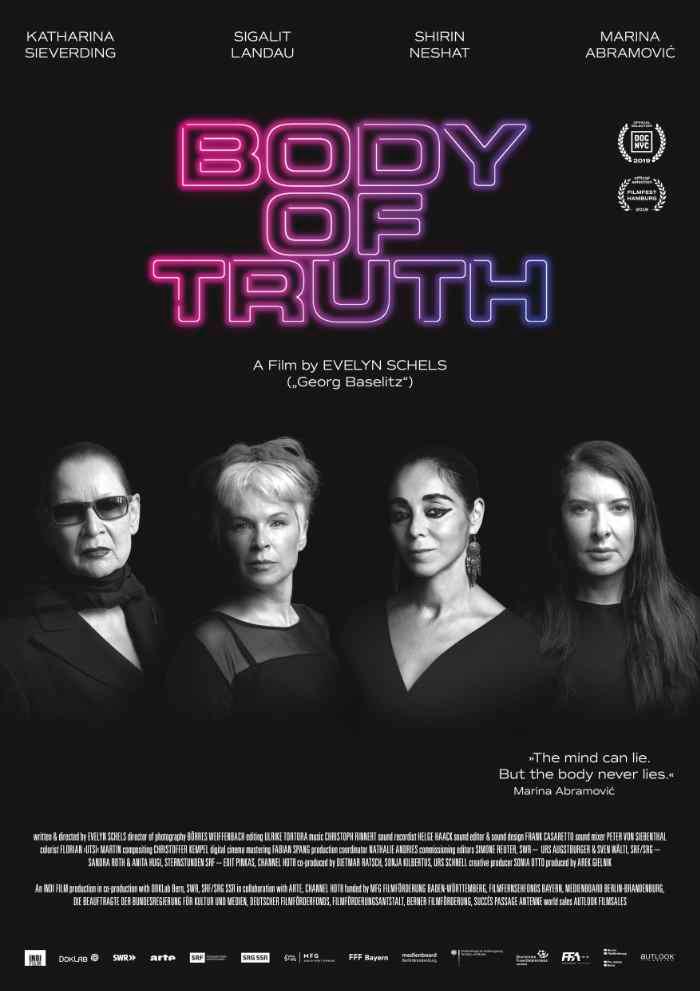 Ciało nie kłamie Body of Truth) towarzyszy czterem artystkom w fascynującej, pełnej emocji podróży przez ich biografie: serbskiej performerce Marinie Abramović, izraelskiej artystce zajmującej się wideo i instalacjami Sigalit Landau, irańskiej artystce fotograficznej i filmowej Shirin Neshat oraz niemieckiej fotografce Katharinie Sieverding. Ich życiorysy były kształtowane przez konflikty społeczne i osobiste doświadczenia z wojną, przemocą i uciskiem, które przekształciły w sztukę. Środkiem wyrazu swoich działań uczyniły to, co najbardziej osobiste: własne ciała.