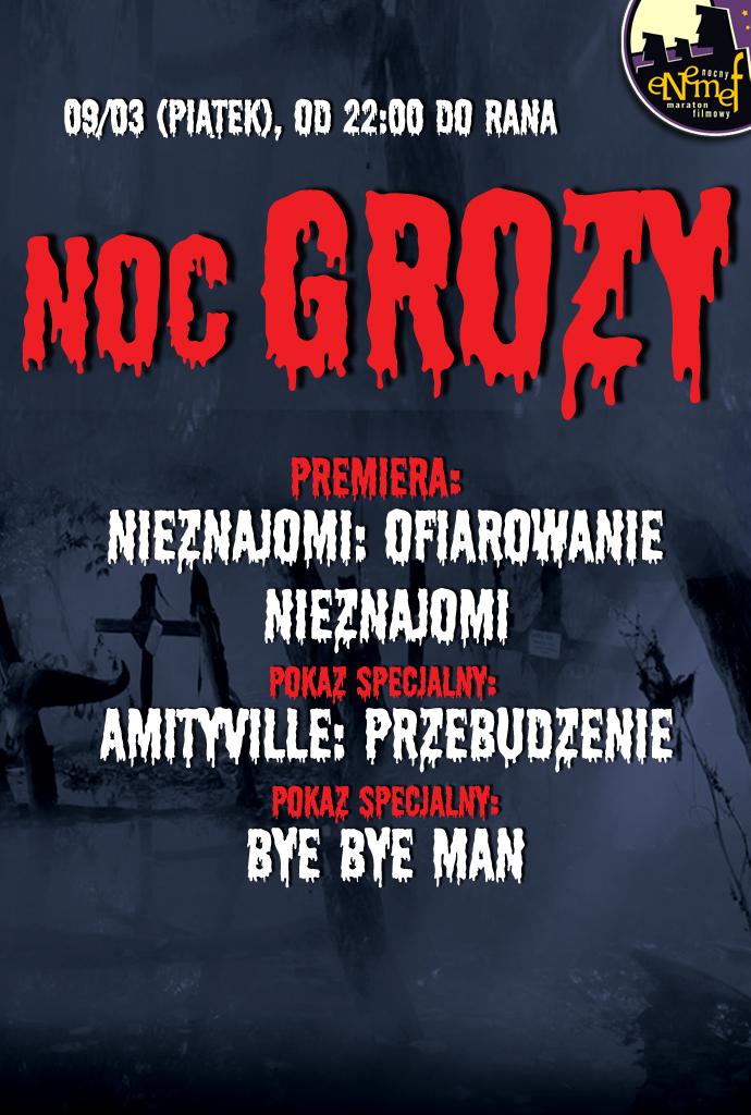 ENEMEF: Noc Grozy to niepowtarzalne wydarzenie dla fanów mocnych wrażeń, ze świetnym premierowym repertuarem: w programie aż trzy pokazy premierowe! Żądne zemsty duchy, psychopatyczni mordercy, klątwy i potworne tajemnice sprawią, że tej nocy każdego widza przeniknie na wskroś prawdziwy aż do bólu strach! Wszystko to za sprawą czterech mrożących krew w żyłach filmów grozy.