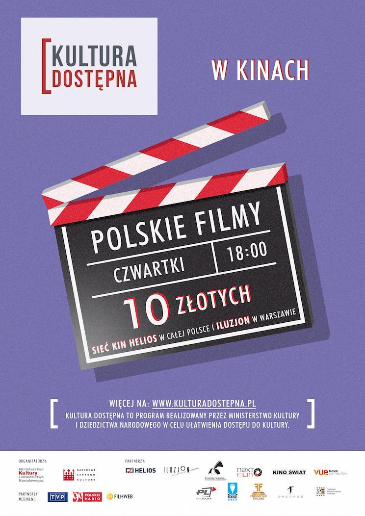 W ramach projektu Kultura Dostępna w kinach, realizowanego przez Narodowe Centrum Kultury, który jest częścią Programu Ministerstwa Kultury i Dziedzictwa Narodowego Kultura Dostępna, co czwartek o godzinie 18:00 będą wyświetlane polskie filmy za 10 zł dla każdego. Projekcje odbędą się we wszystkich kinach sieci Helios w całej Polsce oraz w Kinie Iluzjon w Warszawie.