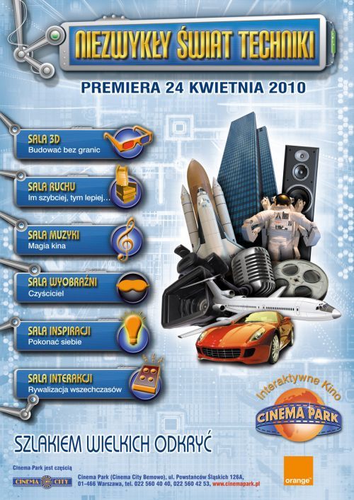 Niezwykły świat techniki to program w czasie którego poznamy fascynujące odkrycia i niezwykłe wynalazki. W Sali 3D zobaczymy z bliska zapierające dech w piersiach wieżowce sięgające chmur, tunele oraz mosty. W Sali ruch w niezwykle szybka podróż, aby dowiedzieć się, jak rozwijał się transport na przełomie wieków. W Sali muzyki przypomnimy sobie jak ewaluowała X muza czyli kino, od prostych, jednobarwnych obrazów, aż do dzisiejszej technologii cyfrowej. Sala wyobraźni to opowieść o zaawansowanych rozwiązaniach technologicznych i zastosowaniu najnowszych odkryć w praktyce. Sala inspiracji to chwila refleksji nad historia pewnej nastolatki, która pomimo przeciwności losu potrafiła znaleźć w sobie siłę aby rozwijać swoja pasję. Na koniec sala interakcji zaprosi nas do rywalizacji podczas interaktywnej akademii.
