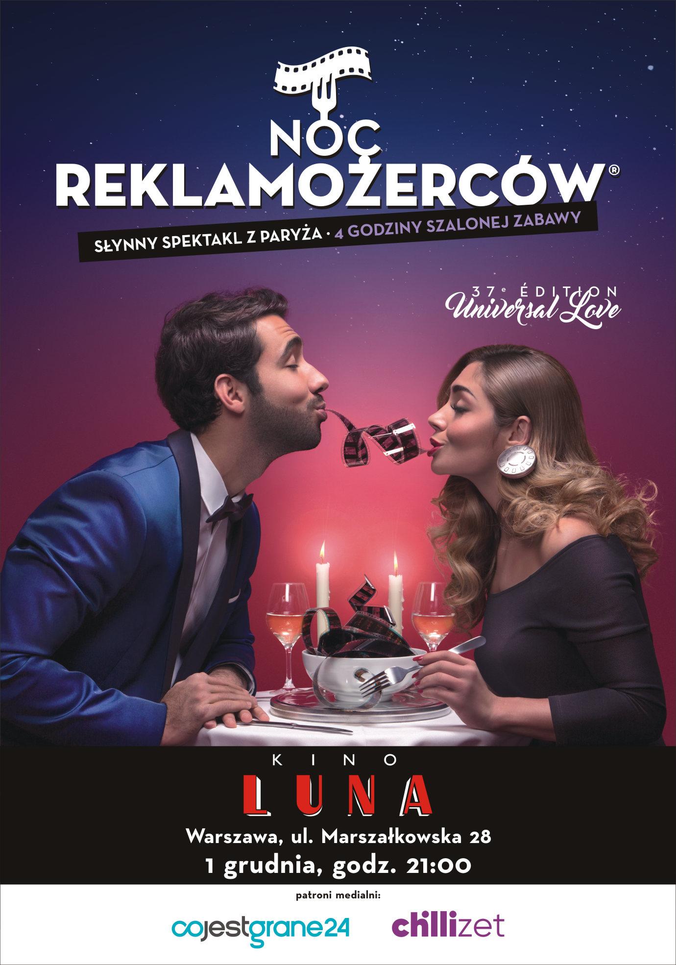 Co roku w polskiej Nocy Reklamożerców bierze udział kilka tysięcy fanów reklamy i dobrej zabawy. Głównym tematem 37. Nocy Reklamożerców jest Universal Love. Miłość, emocje, zazdrość, pożądanie będa odmieniane przez wszystkie reklamowe przypadki i wszystkie kontynenty. W ten miłosny kontekst wpisuje się m.in. panorama zmysłowych reklam bielizny Triumph. Miłosne, i nie tylko, wątki odnajdziemy również w przeglądzie reklam afrykańskich: Nigeria, Kongo, Ghana, Afryka Południowa. Jak co roku plejada gwiazd show biznesu, sportu i polityki w nowych, reklamowych rolach rozśmieszy nas i wzruszy do łez. Reklama społeczna będzie walczyła z najważniejszymi cywilizacyjnymi problemami, w tym z marnotrawstwem żywności. Jak co roku odrestaurowane perełki z reklamowego lamusa przypomną nam vintage blaski reklam sprzed poł wieku. Plejada robotów, dronów i wyposażonych w sztuczną inteligencje postaci powalczy o lepszy świat, a także o lepszą sprzedaż.