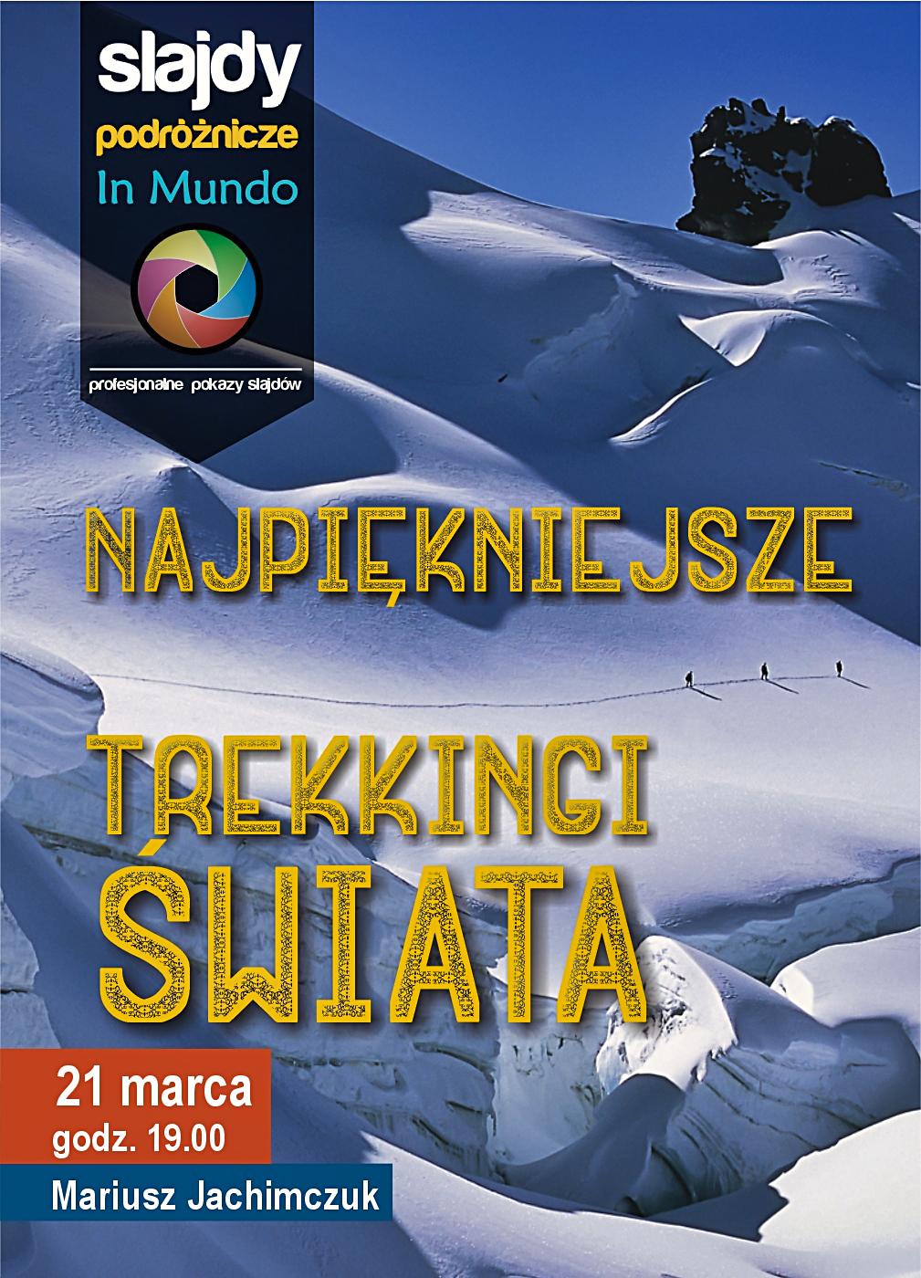 Zapraszamy na subiektywną relację z wędrówek po najpiękniejszych górach świata. Zobaczymy Himalaje, Andy, Denali na Alasce i góry w Afryce. Mariusz Jachimczuk przemierzył góry legendarnymi trasami jak trekking wokół Annapurny, ale również pasma rzadziej odwiedzane, takie jak Góry Księżycowe w Ugandzie czy Kordyliera Biała w Peru z pięknym szczytem Alpamayo. Będą to jednodniowe wycieczki do punktów widokowych, jak i kilkudniowe trasy z namiotem. Wybierzemy się też na kilka wulkanów, m.in. wygasły, blisko 6 tys. Licancabur w Boliwii i aktywny wulkan z największym jeziorem lawy na świecie Nyaragongo w DR Kongo. Będziemy też spotykać na szlaku mieszkańców rejonów górskich, zobaczymy barwny i zaskakujący festiwal w Andach, malowniczo położone klasztory buddyjskie czy też rodzinę goryli górskich.