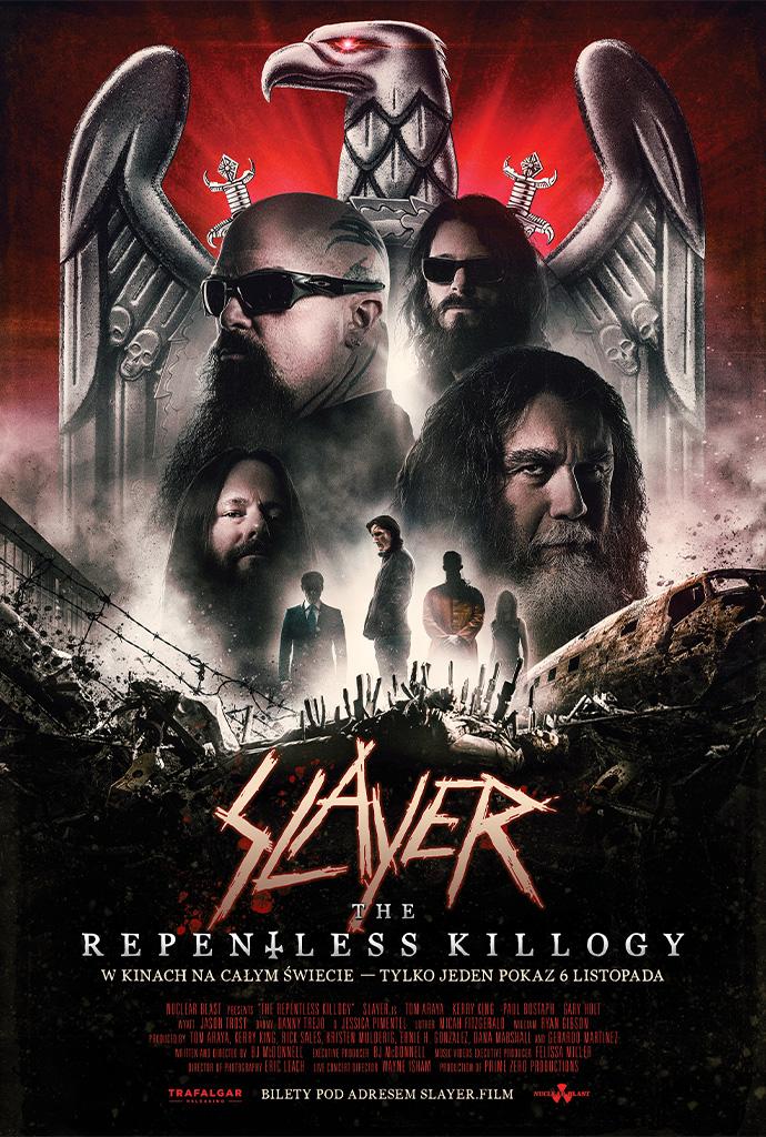 Przez prawie cztery dekady Slayer udowodnił, że jest to najważniejszy thrash-metalowy zespół na świecie - zespół, z którym porównuje się wszystkie pozostałe kapele. Dzięki swojemu miejscu w historii muzyki Slayer - Tom Araya, Kerry King Gary Holt i Paul Bostaph - w połączeniu z firmą dystrybucyjną Trafalgar Releasing, Nuclear Blast Records i Prime Zero Productions, przeprowadzą atak Slaytanic na wielki ekran. „Slayer: The Repentless Killogy” zadebiutuje w kinach na całym świecie 6 listopada 2019 r. To jednorazowe bezkompromisowe wydarzenie obejmie emisję krótkiego filmu połączonego z całym występem Slayera. Nagranie koncertu zrealizowano podczas koncertu 5 sierpnia 2017 r. w legendarnym Forum w Los Angeles. Podczas pokazu zobaczymy również ekskluzywne przywitanie fanów w kinach nagrane w Ameryce Południowej podczas ostatniego etapu ich światowej trasy koncertowej. Slayer na wielkim ekranie tylko jednego dnia.
