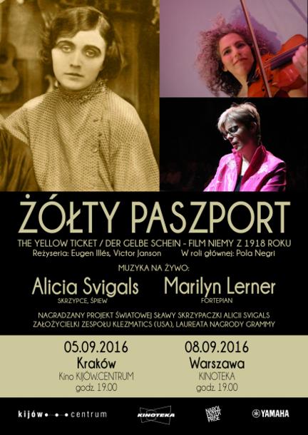 „Żółty paszport” dokumentuje Warszawę z 1918 roku. Film został nakręcony w okupowanej wówczas przez armię pruską Warszawie, a jako plenery zostały wykorzystane okolice Nalewek. Jest to zatem unikatowa dokumentacja tzw. „Dzielnicy Żydowskiej” dawnej Warszawy i życia jej mieszkańców. W okresie nazistowskim próbowano zniszczyć wszystkie kopie filmu, gdyż film ten przedstawiał Żydów w pozytywnym świetle. Nowe opracowanie filmu (autorska muzyka i tłumaczenie napisów na jęz. angielski) jest dziełem Alicii Svigals, wszechstronnego muzyka, jedną z najwybitniejszych obecnie skrzypaczek klezmerskich na świecie. Była nie tylko jednym z założycieli słynnego zespołu Klezmatics, kilkakrotną laureatką nagród Grammy, ale współpracowała też z wykonawcami takimi jak m.in. Kronos Quartet (kompozycja), Allen Ginsburg, Whoopi Goldberg, Susan Sarandon, czy Robert Plant i Jimmy Page zzespołu Led Zeppelin. W projekcie "Yellow Ticket" towarzyszy jej znana kanadyjska pianistka jazzowa Marilyn Lerner specjalizująca się w gatunkach free jazz, new music tinged improvisation, oraz Ashkenazic folk music. „Żółty paszport”, reż. Eugen Illés, Victor Janson, Paul L. Stein, Niemcy 1918, 58 min. Lea, młoda dziewczyna, mieszka w żydowskiej dzielnicy Warszawy z chorym ojcem. Lubi czytać, chce studiować medycynę, aby pomóc swojemu choremu ojcu. Wkrótce jej ojciec umiera, a jej opiekun, Ossip Storki, jest wezwany do pracy jako gubernator. Kiedy przyjeżdża do Petersburga, dowiaduje się, że może pracować tylko świadcząc tzw. usługi seksualne. Do tego potrzebny jej będzie specjalny dokument - "żółty paszport". W przeciwnym razie grozi jej więzienie.